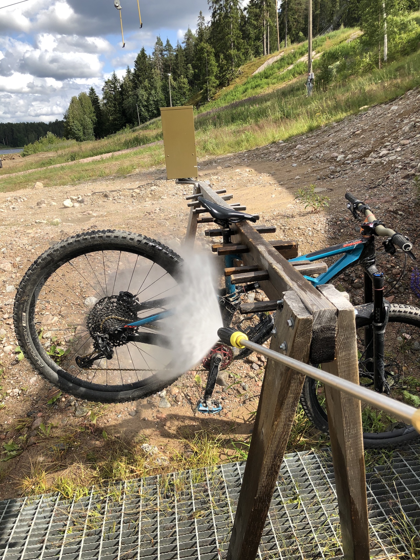 Bike Parkissa ajamisen jälkeen voi pulahtaa pesulla kirkasvetisessä Saimaassa ja pyörällekin löytyy pesupaikka.